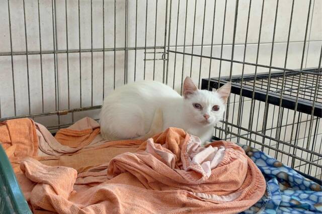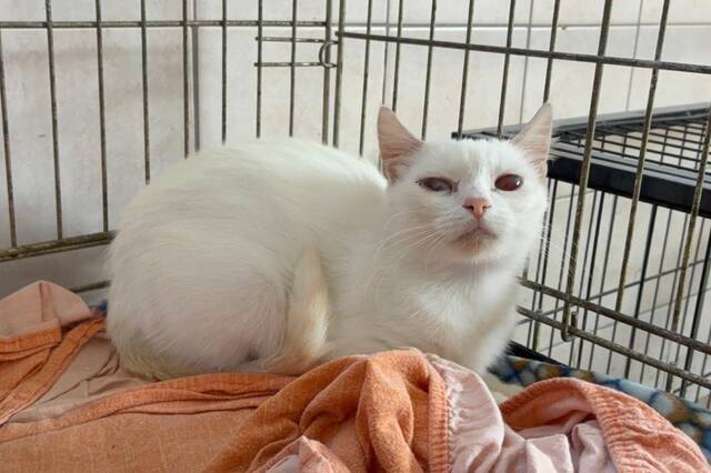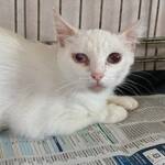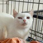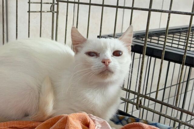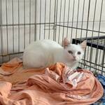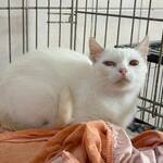 Checki ist eine zarte, schneeweiße Katzendame, deren Schwanz in warmen Rot- und Beigetönen gestreift ist. Eines ihrer Augen ist leider beschädigt, während das andere strahlend blau leuchtet.