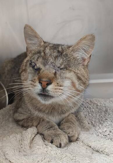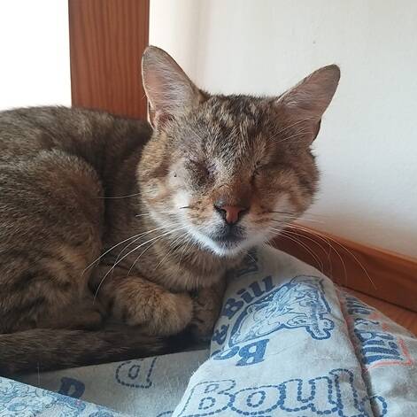 Wonki (geb. 07.05.2021) wurde, wie die meisten Katzen auch, auf der Straße gefunden und aufgrund seines schlechten Gesundheitszustandes ins Tierheim von ANAA Madrid gebracht. Seine Augen waren zu dem Zeitpunkt so stark geschädigt, dass sie beide entfernt werden mussten, zudem wurde er auch FIV positiv getestet. Natürlich wünschen wir uns trotzdem ein schönes Zuhause für ihn.