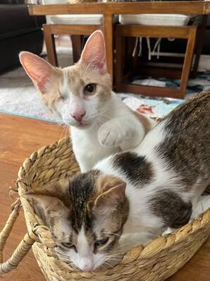 Die beiden Brüder Mudi und Locky (beide geb. 20.08.2024) wurden als sehr junge Kitten mit schwer geschädigten Augen und stark unterernährt von der Straße gerettet. Mudi´s rechtes Auge konnte leider nicht mehr gerettet werden und wurde operativ entfernt. Dies stört den kleinen Katermann aber keineswegs. Dank guter tierärztlicher Versorgung und der unermüdlichen Liebe ihrer Pflegefamilie haben sie sich schnell wieder erholt und sind zu gesunden Jungkatern herangewachsen. Beide sind wieder vollkommen gesund und benötigen keine Medikamente mehr.