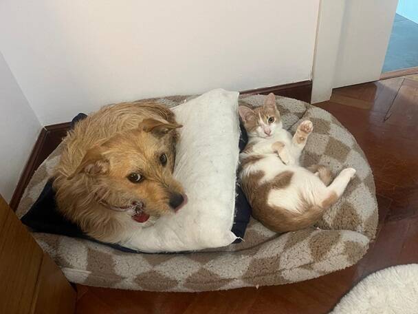 Da die beiden den Hund der Pflegestelle kennen und lieben gelernt haben, sollte ein katzenerfahrener Hund auch im neuen Zuhause kein Problem darstellen. Dieser sollte jedoch mit den wilden Katzenspielchen klarkommen und diese im besten Fall auch genießen.