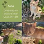 Beschreibung: Steckbrief Geboren: ca. August 2025 Geschlecht: männlich Rasse: EKH Kastriert: nein, zu jung Geimpft: Tollwut Gechippt: ja Katzenaids (FIV): zu jung Leukose (FeLV): zu jung Katzenverträglich: ja Hundeverträglich: denkbar Kinder: ja Handicap: ja, dreibeinig Freigang: ja, in verkehrsberuhigter Gegend Aufenthaltsort Rifugio Arca Sarda Fusa – kleiner Dreibeinkater mit großem Herzen Mutterlose und ausgesetzte Kitten haben nur eine geringe Chance, ihre Kindheit zu überleben. Noch düsterer sind die Aussichten, wenn ein Katzenkind körperlich eingeschränkt ist – so wie der kleine Fusa. Aufmerksame deutsche Urlauber entdeckten das Kerlchen in ihrer Feriensiedlung und sahen sofort, dass Fusa nur noch drei Beine hatte. Niemand vor Ort kannte den zutraulichen Kater, niemand hatte das geringste Interesse an ihm. Wie er den linken Hinterlauf verlor, werden wir wohl niemals erfahren. Was wir jedoch wussten, war, dass er auf sich gestellt niemals eine Zukunft haben würde. Die tierlieben Touristen fuhren viele viele Kilometer, um Fusa zu uns und in Sicherheit zu bringen... Hier im Rifugio erobert Fusa alle Herzen im Sturm; Menschen gegenüber ist er sehr aufgeschlossen und verschmust und auch mit den anderen Katzenkindern versteht er sich bestens – besonders mit Nico, der genau wie Fusa sehnsüchtig darauf wartet, adoptiert zu werden. Natürlich ist ein fehlendes Bein ein Handicap, aber Fusa wünscht sich neben der Nähe zu Artgenossen auch die Möglichkeit, ungefährdet draußen herumtoben zu können und Gras unter den Pfötchen zu spüren. Dir macht es nichts aus, dass Fusa ein Beinchen fehlt – und Du möchtest ihm einen Platz in Deinem Heim und Deinem Herzen schenken? Dann melde Dich einfach unter katzenvermittlung(at)respektiere.com!. Gerne bringt der Kleine seinen besten Freund Nico oder einen anderen Kumpel mit zu Dir. Wir vermitteln bundesweit an Menschen, bei denen unsere Katzen Freigang und Katzengesellschaft genießen können.