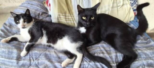 Felix (schwarz-weiß) & Nero (schwarz mit weißem Brustfleck), zwei rumänische Katerchen, siedelten sich eines Tages in der Nähe des Hauses einer tierlieben Frau an. Da waren sie etwa ein halbes Jahr alt. Die nette Dame gab ihnen Futter und es dauerte nicht lange, da drängten die beiden auch schon ins Haus. Natürlich wurde ihnen Einlass gewährt. Sie wurden kastriert und geimpft und lebten fortan friedlich mit den dort lebenden Hunden und ihrer Pflegemama zusammen.
