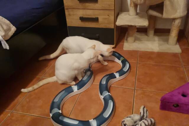 Beim Spielen mögen es Amaya und Flöckchen eher ruhig und für sich. Wenn die wilderen Katzen durchs Zimmer jagen, laufen sie zwar manchmal fröhlich mit, sind aber beide keine großen Fans von Raufereien. Viel lieber beschäftigen sie sich selbstständig mit Bällen, kleinen Mäusen oder allem, was sich über den Boden schubsen lässt. Sie genießen es, in ihrem eigenen Tempo zu spielen und kleine Beuteobjekte zu jagen, ohne dabei laut oder wild zu werden.