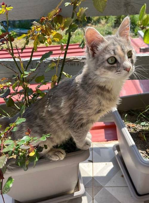 April 2026: Elina wurde gemeinsam mit ihrem Bruder Demitry, der bereits vermittelt werden konnte, in einer Box ausgesetzt. Eine Tierfreundin hat die beiden gefunden und bei sich aufgenommen. Elina ist eine sehr freundliche, verspielte und verschmuste Jungkatze, die an das Zusammenleben mit anderen Katzen gewöhnt ist. Vermutlich hatte sie im Kitten-Alter einen Beinbruch, der aber verheilt ist. Manchmal sieht man ein kleines Humpeln, welches Elina selbst aber nicht stört oder einschränkt. Elina wird nun noch kastriert und ist dann bereit für die Reise in ihr neues Zuhause. Elina wiegt aktuell x kg.
