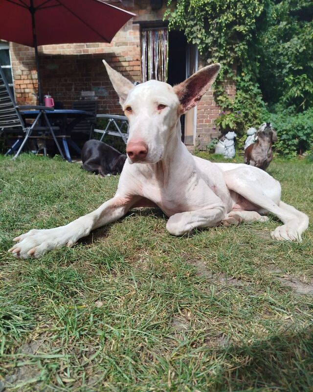 Falconeti hatte das Glück, im August 2025 zusammen mit Podenca Esmeralda auf eine Pflegestelle nach Mecklenburg-Vorpommern zu ziehen. Dort leben die beiden mit den drei eigenen Hunden der Pflegestelle zusammen. Falconeti ist mit allen verträglich, sucht keinen Streit, lässt sich aber auch nicht alles gefallen. Er verträgt sich auch mit den vorhandenen Katzen. Die Hühner interessieren ihn Zuhause nicht. Er ist sehr verkuschelt und liebt es, gestreichelt zu werden. Er spielt gerne mit den anderen Hunden, Vermittlung: Bundesweit - Aufenthaltsort: 17209 Eldetal