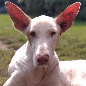 Bei unserer Pflegestelle Finca Esquinzo ging Mitte Juni 2024 eine Notfallmeldung ein. Ein weißer Podenco mit starker Sonnenallergie würde dringend Hilfe benötigen. Als Andrea und Pancho die Fotos von Falconeti sahen, zögerten sie keinen Moment und boten an, den armen Rüden sofort aufzunehmen. Noch am selben Tag trafen sie sich mit dem Besitzer, dem Finder und dem Hund in der Klinik und übernahmen den durch die juckende Allergie blutig gekratzten Hundemann. Es wurde ein großes Blutbild angefertigt, das aber, außer einer leichten Anämie, kein weiteres Krankheitsbild aufwies. Bepackt mit Antibiotika und Kortison-Tabletten fuhren sie mit Falconeti auf die Finca.