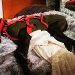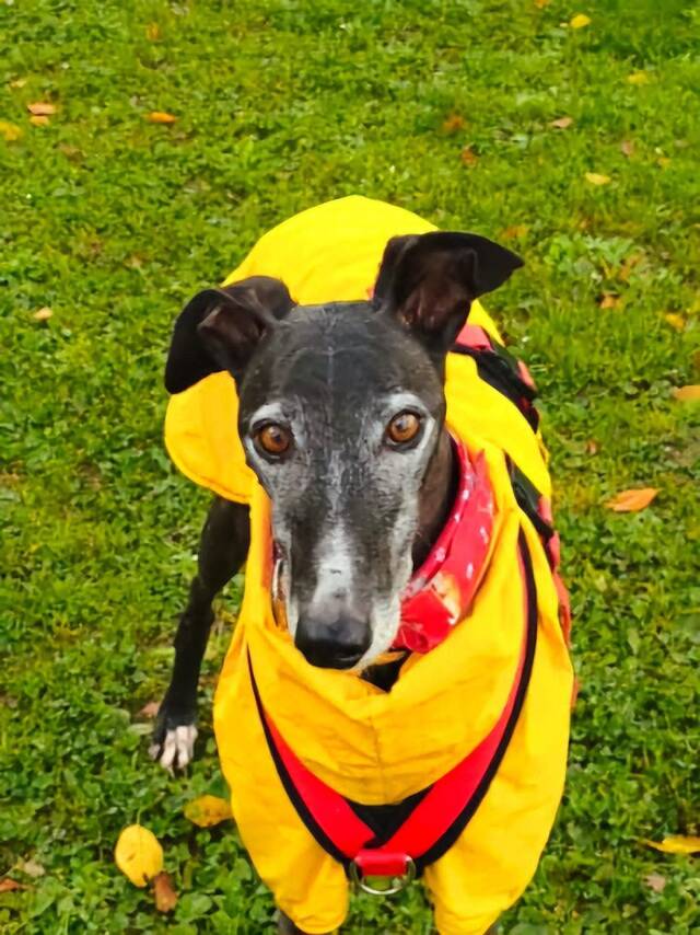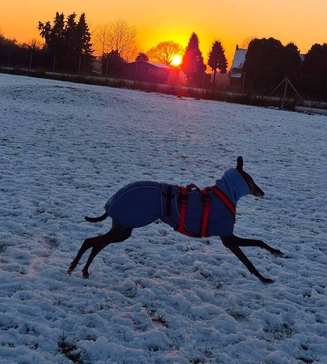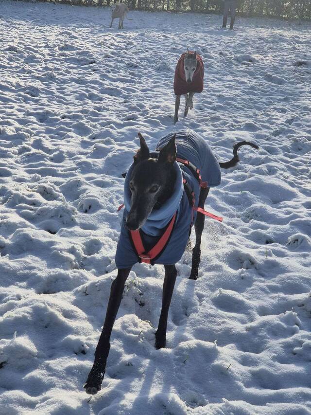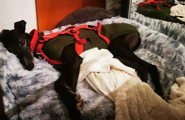 Palermo lebt seit dem 18. Januar 2025 bei seiner Pflegefamilie zusammen mit einem Galgorudel. Die ersten Tage hat er sein Hundebett nicht verlassen. Man musste ihn mit dem Geschirr vorsichtig in den Garten heben. Seine langen Galgobeine wollte er nicht benutzen.