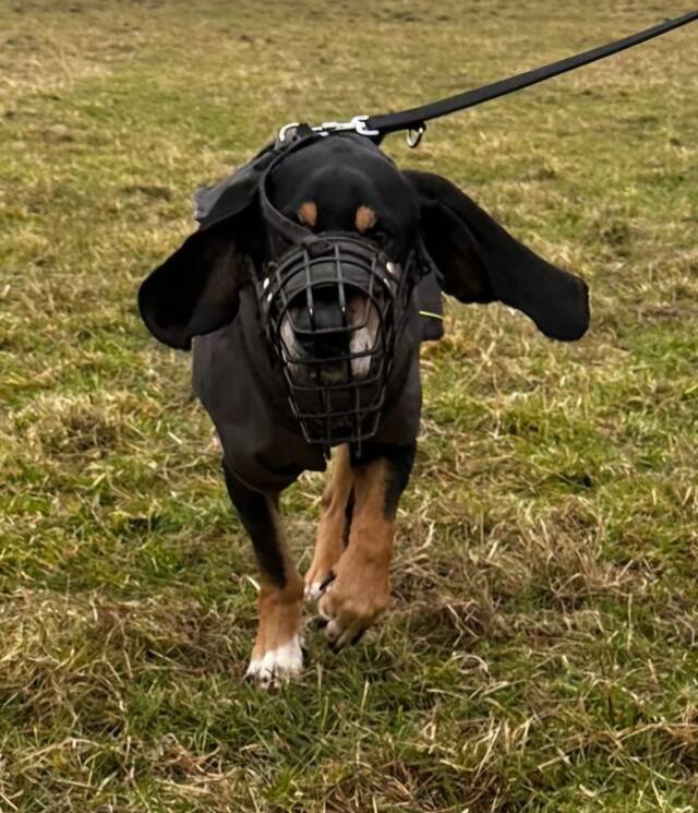 In der Trainingspension stellte sich heraus, wie tief das Trauma wirklich liegt. Rex hatte bis dato einfach überhaupt keine guten Assoziationen mit den Menschen, keinen Anlass, harmonisches Zusammenleben überhaupt zu begreifen. Es zeigten sich angstbedingte Aggressionen, Ressourcenverteidigung; Rückzug und Überforderung gehörten zu den in Spanien erlernten Verhaltensweisen, denen man hier mit viel Empathie, Konsequenz und Geduld Paroli bietet. Schritt für Schritt. Derzeit trägt Rex dauerhaft einen speziellen Maulkorb. Dieser Gedanke macht erstmal stutzig, jedoch ermöglicht diese Maßnahme deutlich mehr Freiheiten für das Tier und ebnet die Bahn für das Training. (Der getragene Maulkorb ermöglicht Futter- und Wasseraufnahme, Hecheln etc. und ist gut gepolstert, so dass er nicht scheuert oder anderweitig behindert. Jedoch kann er so niemanden beissen und das Training läuft sehr, sehr viel besser so).