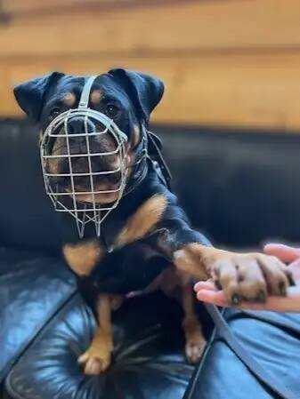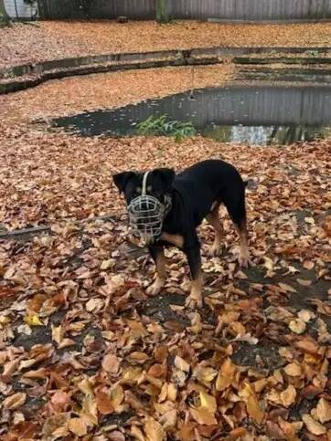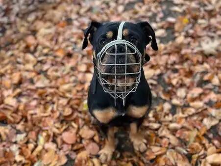 Spike trägt souverän einen Maulkorb - wir empfehlen, diesen besonders in der Anfangszeit und draußen zu nutzen.