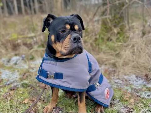 Da Spike in Situationen, die ihn überfordern teils auch zu umgelenkter Aggression neigt, trägt er draußen souverän einen Maulkorb.