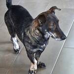 Wir schätzen er ist ein Mix von Dackel und Schäferhund… so was in der Art. Das Fell ist teils rauh und unterschiedlich lang. Wir haben festgestellt, dass er empfindlich auf Berührungen an der hinteren Wirbelsäule reagiert. Er wirkt generell optisch auch ein wenig gekrümmt, welches hauptsächlich an den längeren Hinterbeinen liegen mag. Das sollte aber im Auge behalten werden. Den Pulli braucht er wohl nicht, aber das Überziehen war ein guter Test und hat überraschend gut geklappt. Im Gegensatz zum Geschirr kein Problem.