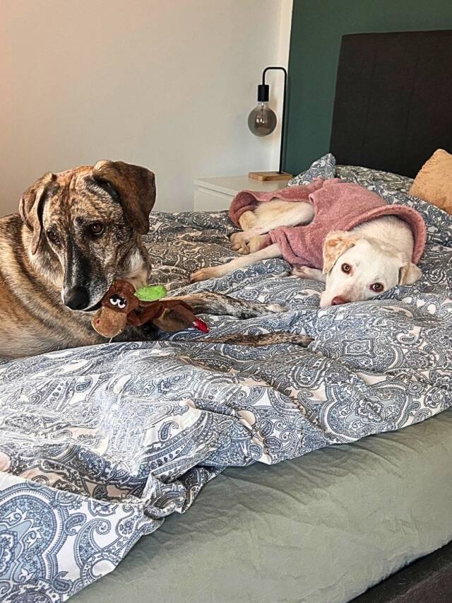 Zu Hause hat Lior gelernt, wie sich Sicherheit anfühlt. Er liebt seine Hundenester, findet dort schnell zur Ruhe und schläft tief und fest. Mit Hündin Kiddy an seiner Seite hat das erste kurze Alleinebleiben schon super geklappt, und auch nach dem Fressen mal zwanzig Minuten allein im Büro liegen – läuft. Autofahren funktioniert ebenfalls, da braucht es nur noch ein wenig Wiederholung. Er bringt etwa 62/63 cm Schulterhöhe mit und wiegt derzeit noch zu wenig – 21,5 kg – aber das holen wir auf, er blüht sichtbar auf.
