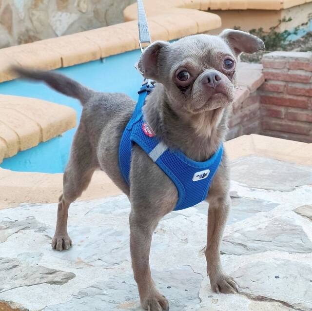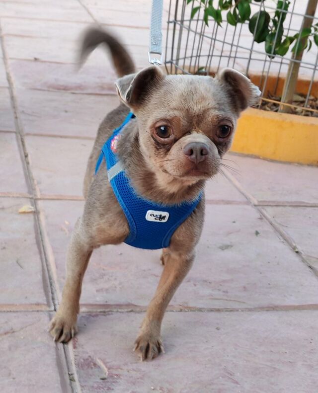 Beschreibung: Geboren: ca. Juni 2022 Rasse: Chihuahua Größe/Gewicht: ca. 26 cm Schulterhöhe bei 2,5 kg Standort: Auffangstation Linares/Südspanien Kastriert, gechipt mit EU Ausweis, geimpft und negativ auf Mittelmeerkrankheiten getestet