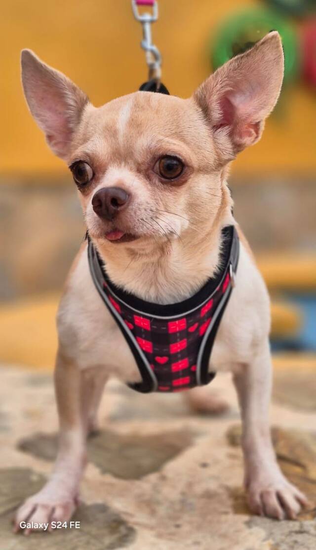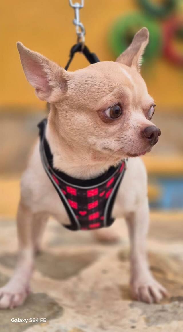 Beschreibung: Geboren: ca. Oktober 2023 Rasse: Chihuahua Größe/Gewicht: ca. 23 cm Schulterhöhe bei 2,8 kg Standort: Auffangstation Linares/Südspanien Kastriert, gechipt mit EU Ausweis, geimpft und negativ auf Mittelmeerkrankheiten getestet