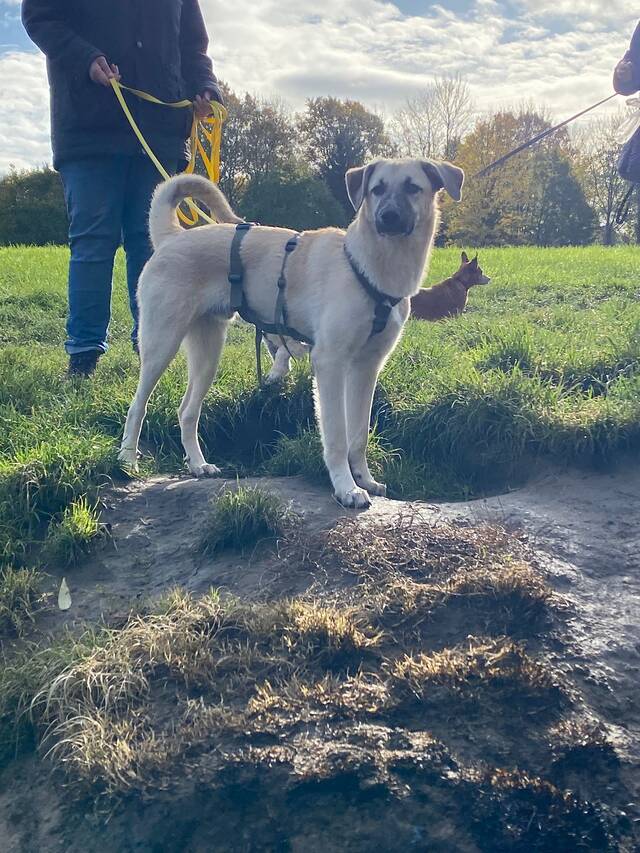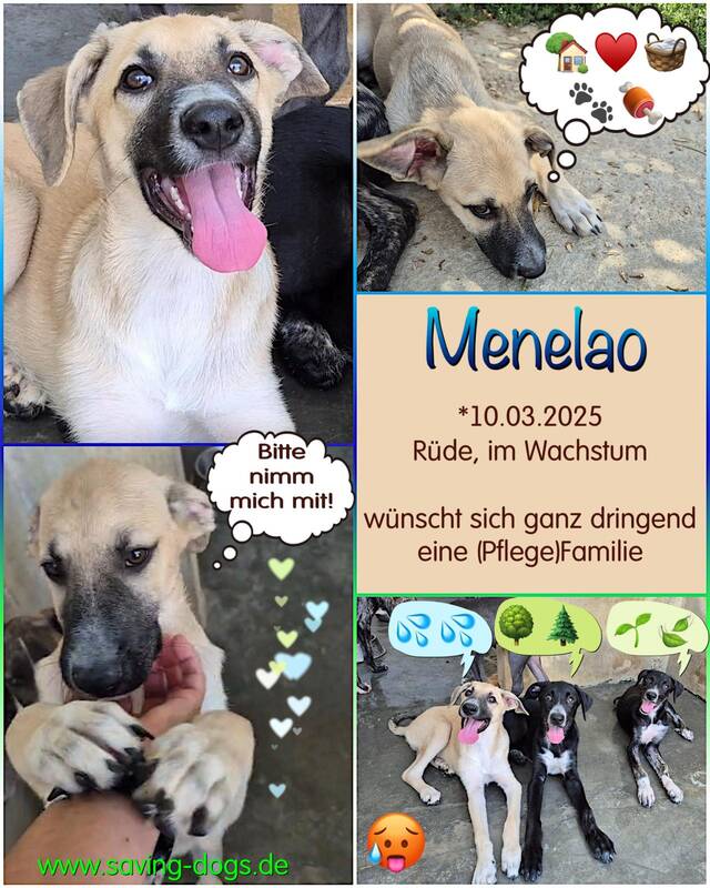 Der hübsche Jungspund mit dem ungewöhnlichen Namen befindet sich seit ein paar Tagen bei seiner Pflegefamilie in Leverkusen. Wie zuvor sein Bruder Achille, der sich ebenfalls in Leverkusen auf unserer sehr erfahrenen Pflegestelle befand, ist auch Menalao ein total lieber Schatz! Er ist bereits nach so kurzer Zeit stubenrein, läuft gut an der Leine und ist verträglich mit Artgenossen beiderlei Geschlechts. Bruder Achille ist bereits vermittelt, nun lernt Menelao mit seinen Pflegeeltern Susanne und Pit die Welt kennen, aber in kleinen Schritten, in den nächsten Tagen ist auch der Besuch einer Hundeschule geplant. Menelao wird bestens auf sein Leben in einer Familie vorbereitet. Der hübsche Kerl wird noch ein bisschen wachsen, das sollte man berücksichtigen und ggfls schon mal nach einem größeren Körbchen Ausschau halten! Wir werden weiter über den Hübschen berichten! Wenn Sie Ihr Herz an den jungen Rüden verloren haben, melden Sie sich gerne bei mir, nach Absprache und Erhalt der Selbstauskunft kann Menelao auch in Leverkusen besucht werden.