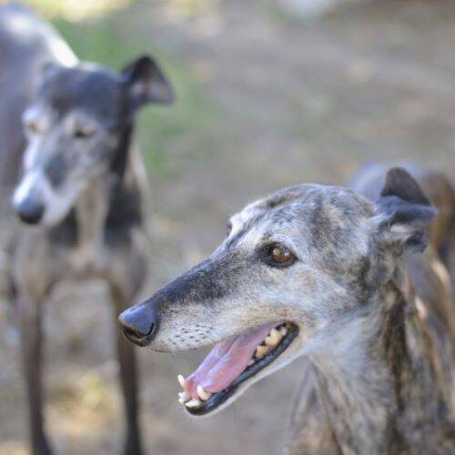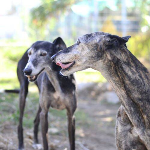 Die beiden Galgas Monja und Hope stammen ursprünglich aus Spanien und wurden als Junghunde von einer italienischen Familie adoptiert. Dort lebten sie viele Jahre eng an der Seite ihrer Menschen und kennen den Familienalltag.