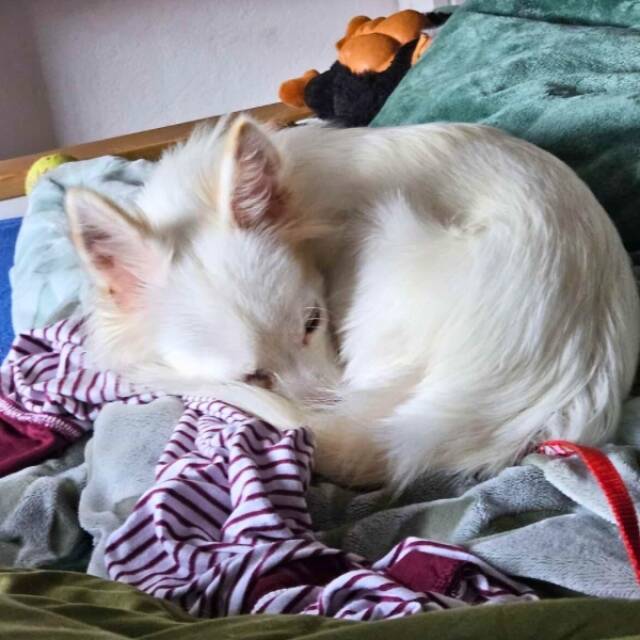 Von da an ging es stetig voran: Poldi wälzt sich im Bett, kaut begeistert auf seinen Quitschbällen und zeigt immer mehr, wie wohl er sich fühlt. Er lernt unglaublich schnell, wird frech, fordert zum Spiel auf und zeigt dabei seinen Humor – auch wenn er manchmal etwas grob ist und an den Bettdecken zerrt. Leckerlies nimmt er inzwischen sicher aus der Hand. Anfangs war es ihm noch suspekt, angefasst zu werden, mittlerweile lässt er sich hochnehmen, schmusen und das Geschirr ohne Probleme anziehen. Er sucht immer öfter die Nähe, stupst an und verteilt liebevolle Küsschen.
