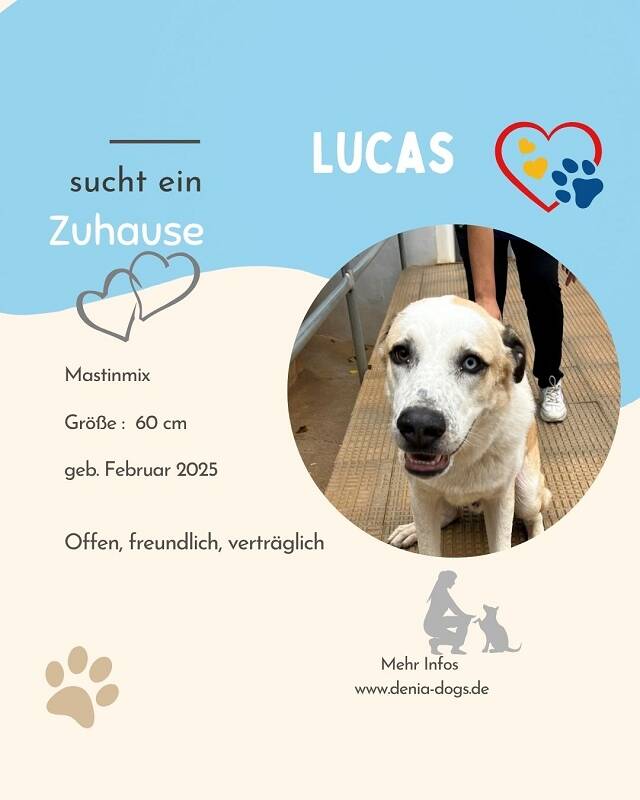 Lucas braucht Menschen mit Zeit und Platz. Vermutlich ist er ein Mastinmix und möchte einmal ein ganz großer werden. Er braucht Menschen die ihn erziehen und ihm die Möglichkeiten geben sich seiner Rasse entsprechend zu entfalten.