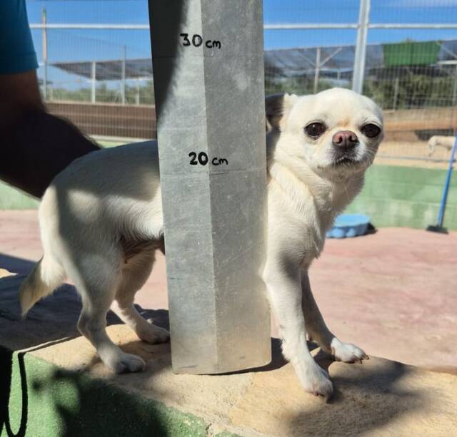Beschreibung: Geboren: ca. Oktober 2023 Rasse: Chihuahua Größe/Gewicht: ca. 22 cm Schulterhöhe bei 2,6 kg Standort: Auffangstation Linares/Südspanien Kastriert, gechipt mit EU Ausweis, geimpft und auf Mittelmeerkrankheiten getestet