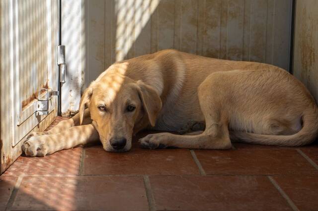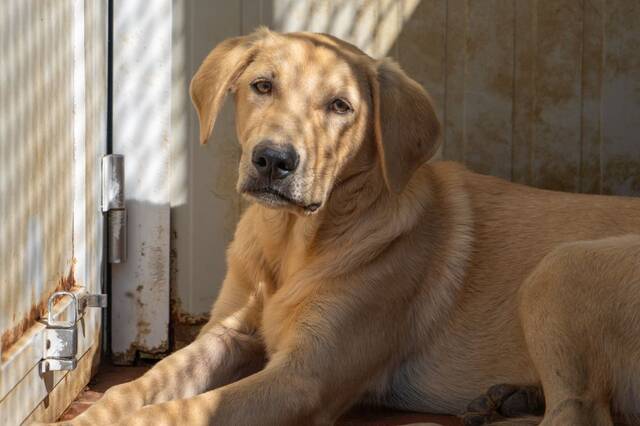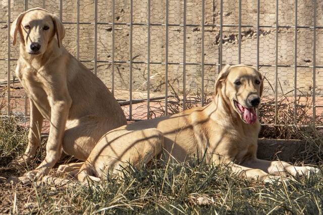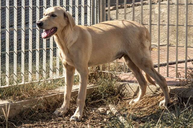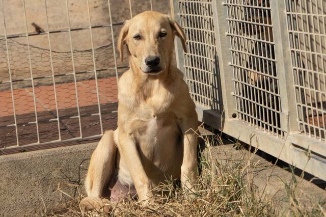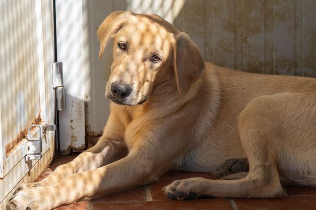 Wie bin ich? Ich bin der kräftigere von uns beiden, aktuell etwa 49 cm groß und noch mitten im Wachstum. Mein blondes Fell ist kurz, mein Körper robust, mein Kopf markant – vielleicht steckt ein Labrador in mir, ganz sicher aber ein Teil Maremmano. Ich bin vorsichtig, ja – aber meine Neugier siegt oft über die Angst. Wenn jemand freundlich und ruhig bleibt, wage ich den Kontakt, lasse mich streicheln und beginne sogar, Nähe zu genießen. Ich lerne schnell, wenn man mir Zeit lässt.