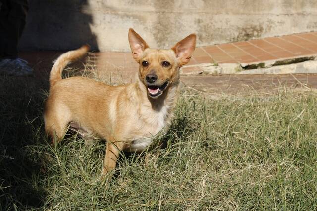 Melanio ist klein, beige-braun, trägt seine Ohren wie zwei stolze Segel und schaut dich mit großen, dunkelbraunen Kulleraugen an, als wollte er sagen: „Na, wo bleibt meine Streicheleinheit?“