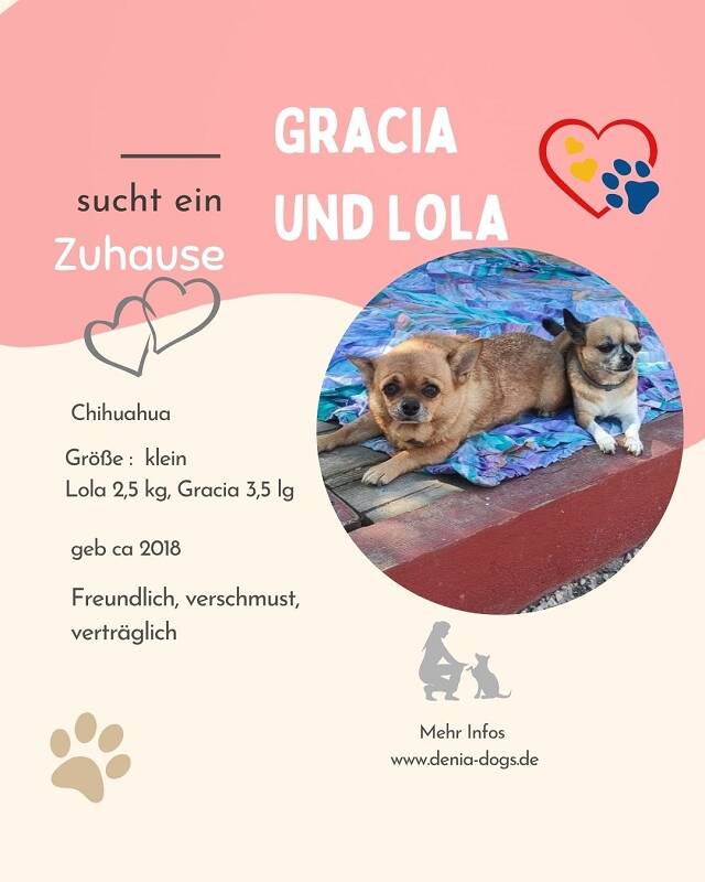 Beschreibung: Gracia und Lola sind zwei herzige Chihuahua Ladys auf der Suche nach einem wunderschönen Zuhause. Die Beiden sind sehr freundlich und verschmust. Lola ist anfangs etwas zurückhaltend, aber nicht ängstlich. Die Ladys sind unaufdringlich, abwartend und kommen nicht sofort auf jeden zugestürmt. Wenn Sie Euch erstmal kennen sind sie unheimlich anhänglich und menschenbezogen. Wir würden uns sehr freuen wenn Gracia und Lola weiterhin zusammenbleiben können. Zu zweit sind diese zauberhaften Mädels sind doch doppeltes Glück oder ? Möchtet Ihr Gracia oder Lola oder am besten Beiden ein Zuhause geben meldet Euch gerne bei ihrer Vermittlerin