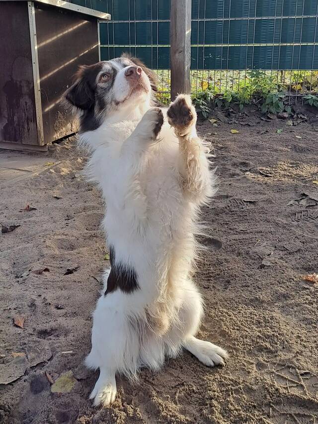 Wenn Balu etwas haben möchte, kann er etwas aufdringlich werden. Daher benötigt er Menschen, die auch ein klares "Nein" äußern können. Balu kennt die Grundkommandos und läuft auch gut an der Leine.