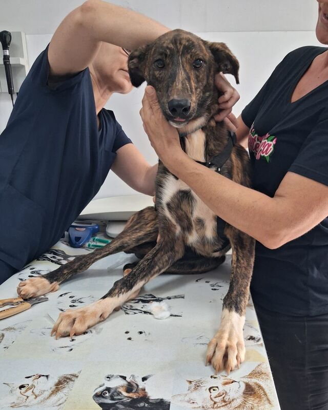 Seinen ersten Tierarztbesuch hat er hinter sich gebracht und sehr gut gemeistert. Alle Untersuchungen hat er ruhig über sich ergehen lassen, sogar die Blutabnahme hat er ohne Gegenwehr geduldet. Die Tierärztin, die die Vorgeschichte des Buben kannte, war ganz bezaubert, er ließ sich von ihr streicheln. Die Autofahrt verlief in der Transportbox ruhig. Trotzdem ist alles Neue noch unheimlich und muss geübt werden. Dazu gehört auch das Geschirr anziehen und an der Leine zu laufen. Das sind jedoch alles kleine Hindernisse, die mit viel Liebe und Geduld schnell gemeistert werden können und sicher zu Routine gehören werden.