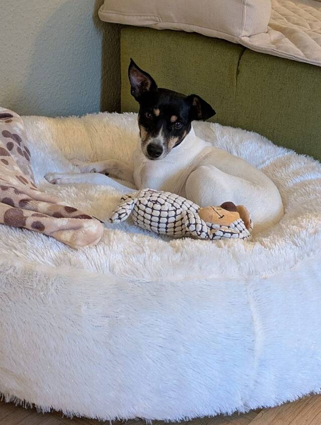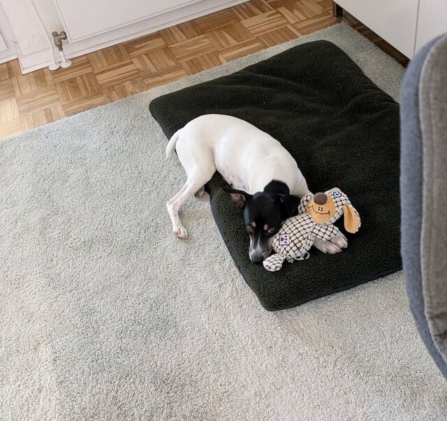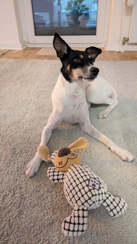 Delta spielt gern, aber nicht überdreht. Sie findet gut in die Ruhe und genießt es, auf ihrer Hundedecke, ihrem Bettchen oder – am liebsten – zusammen mit ihrem Menschen auf dem Sofa zu entspannen. Männern gegenüber ist sie etwas vorsichtiger, aber immer freundlich und zugewandt.
