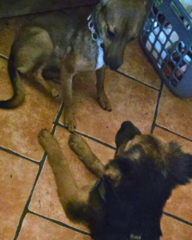 Dann kamen eines Tages Menschen in Uniform. Die hatten wohl gehört, dass wir da draußen ganz allein unterwegs waren. Sie sahen uns und konnten es nicht übers Herz bringen, uns in einem Hundelager abzugeben. Stattdessen riefen sie eine Tierschützerin an. Obwohl sie schon ganz viele Hunde bei sich hatte, hat sie uns trotzdem sofort zu sich geholt – sie hat einfach Ja gesagt.