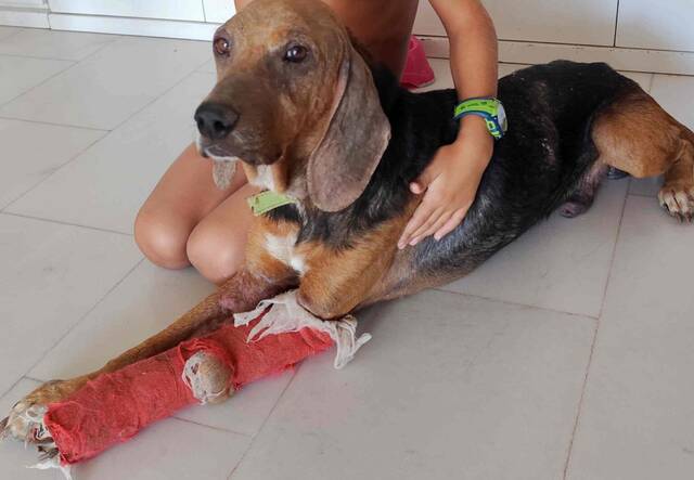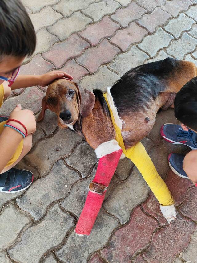 Er bekommt derzeit eine Behandlung mit Milteforan, die am 25. Juli abgeschlossen sein wird. Vor ein paar Tagen wurde die Schiene vom rechten Bein entfernt, das nun vollständig verheilt ist. Der Bruch im linken Bein scheint relativ gut zu heilen, und sobald auch dort die Schiene entfernt wird, wird er voraussichtlich schmerzfrei laufen können – auch wenn er wahrscheinlich sein Leben lang ein wenig hinken wird. Ideal wäre eine Operation, aber bisher wurden bereits über 700 Euro für seine Behandlung ausgegeben, und die Operation würde nochmal so viel kosten.