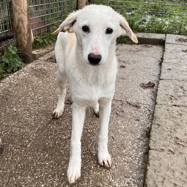 In der Auffangstation lebt sie in einem gemischten Rudel und ist sowohl mit Rüden als auch mit Hündinnen verträglich. Menschen gegenüber ist sie noch etwas schüchtern, aber sie ist neugierig und nimmt Kontakt zum Menschen auf. Aktuell hat sie eine Schulterhöhe von 48 cm, aber sie wird wohl noch ein paar Zentimeter wachsen.