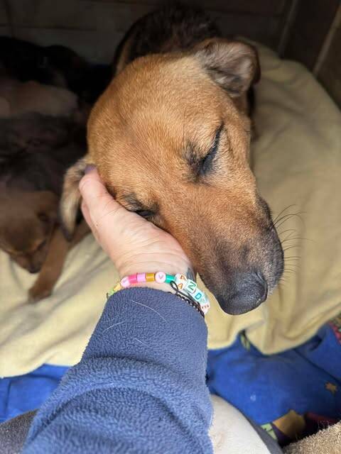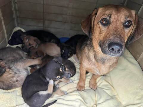 Daggi aus Rumänien tauchte eines Nachts gemeinsam mit ihren 6 Welpen in einer Straße auf, in der niemand sie je zuvor gesehen hatte. Sie heulte die ganze Nacht – ein untrügliches Zeichen, dass die kleine Hundefamilie verlassen/ausgesetzt worden war. Anwohner verständigten am nächsten Morgen eine unserer Tierretterinnen und baten um Hilfe. Natürlich half unsere Tierretterin, fing die Hundefamilie ein und nahm sie mit zu sich auf den Hof. Daggi war über diese Hilfe sichtlich froh und legte sofort vertrauensvoll ihren Kopf in die Hand ihrer Lebensretterin. Auch ihre Kleinen vertraute sie ihrer Pflegemama an. Sie spürte, nun in Sicherheit zu sein.