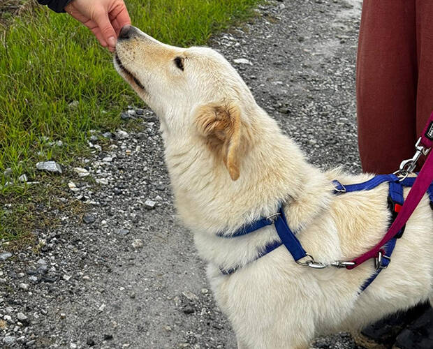 Mittlerweile ist sie aus ihrem Schneckenhaus herausgekommen. Sie zeigt sich als eine fröhliche Hündin, der auch die Leine oder das Geschirr kein Unbehagen mehr auslöst.
