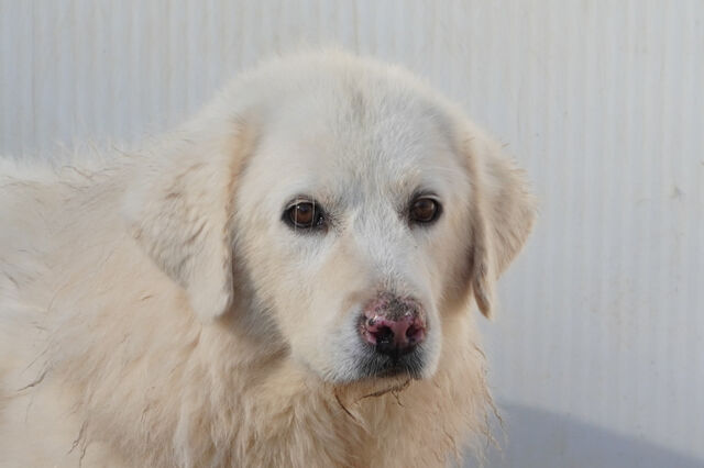 Libero sieht aus wie ein kleiner Eisbär. Sein dichtes, schneeweißes Fell, die weichen Formen und die ruhige Ausstrahlung lassen ihn besonders sanft wirken. Selbst im Oktober ist seine helle Nase noch von der Sonne verbrannt – ein stilles Zeichen seiner Zeit draußen, ungeschützt und sich selbst überlassen. Die kleinen, bartähnlichen Haare an seinem Kinn verleihen ihm das Aussehen eines weisen, nachdenklichen Begleiters.