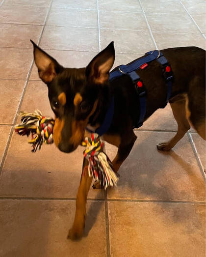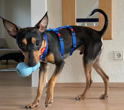 Der Rüde ist fast noch ein Welpe und daher sehr verspielt und wahnsinnig neugierig. Er muss alles neue kennen lernen und ist anfangs noch recht schreckhaft. Der kluge kleine Kerl lernt aber schnell. Stubenrein ist er bereits und er kennt Hundegeschirr und Leine, daran laufen wird geübt. Aktuell ist draußen aber jeder Grashalm unglaublich spannend, so dass er genau untersucht werden muss. Treppen steigen möchte er noch nicht, das muss er noch üben. Er ist ein aktiver, freundlicher Junghund, der nichts gegen Streicheleinheiten hat aber noch lieber tobt und rennt er herum. Man muss ihm daher helfen zur Ruhe zu kommen. Er ist aufmerksam und bellt, wenn es klingelt oder er im Garten fremde Menschen hört. Der Rüde ist gut verträglich mit Artgenossen und dürfte auch zu einem weiteren Hund oder in ein bestehendes Hunderudel einziehen. Den Katzentest hat er ebenfalls bestanden, wir möchten aber darauf hinweisen, dass das eine Momentaufnahme ist und die betreffende Katze Hunde kennt.
