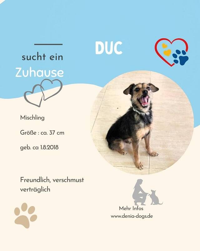 Anfangs zeigt sich Duc etwas unsicher, doch er fasst schnell Vertrauen. Er ist ein sehr freundlicher Bursche, der es liebt, gestreichelt und gekuschelt zu werden. Mit anderen Hunden zeigt er sich ausgesprochen verträglich.