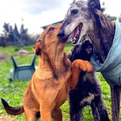 Hope und Monja, unsere beiden Galgas im Rifugio, bringen Zicky und Zuppa respektvolles Sozialverhalten in einer Hundegruppe bei und zeigen den beiden manchmal übermütigen Welpen, wo ihre Grenzen sind.