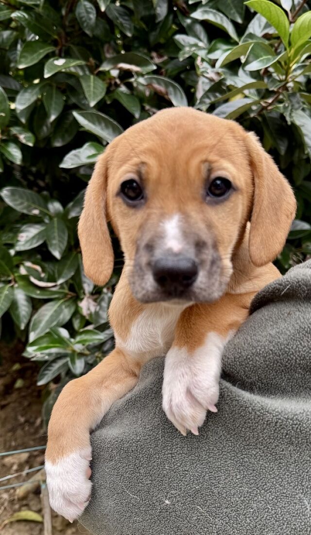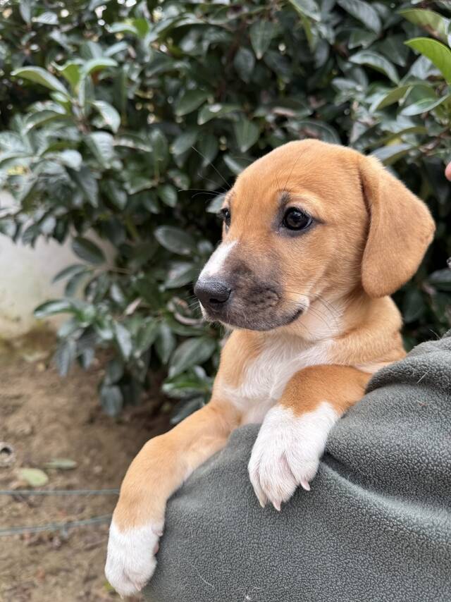 Salvina, die beim Auffinden erst eine Hand voll Hündchen war, ist in der Zwischenzeit schon ein gutes Stück gewachsen. Ein rehbraunes Stückchen Zucker, verspielt, neugierig, tapsig, lieb und unbeschwert - kurz zusammengefasst: unwiderstehlich niedlich. Oder einfach so, wie Welpen eben sind. Salvina hat wie Sady und Sajoscha etwas weiß im Gesicht, allerdings nur einen Strich auf dem Nasenrücken.