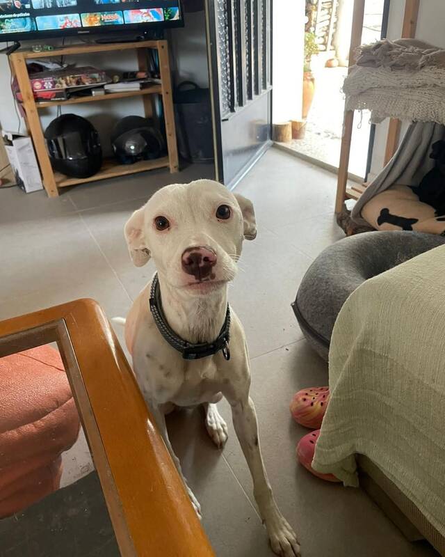 Die hübsche Hündin lebt mit anderen Hunden und Katzen zusammen und ist sehr sozial. Kinder leben ebenfalls in der Familie. Riu ist menschenbezogen und kennt das Leben im Haus. Sie geht gern spazieren, ist bei neuen Situationen aber anfangs zurückhaltend und schüchtern. Wenn sie einmal Vertrauen gefasst hat, zeigt sie sich als fröhliche und verschmuste Hündin, die gern spielt und mit ihren Artgenossen um die Wette rennt.