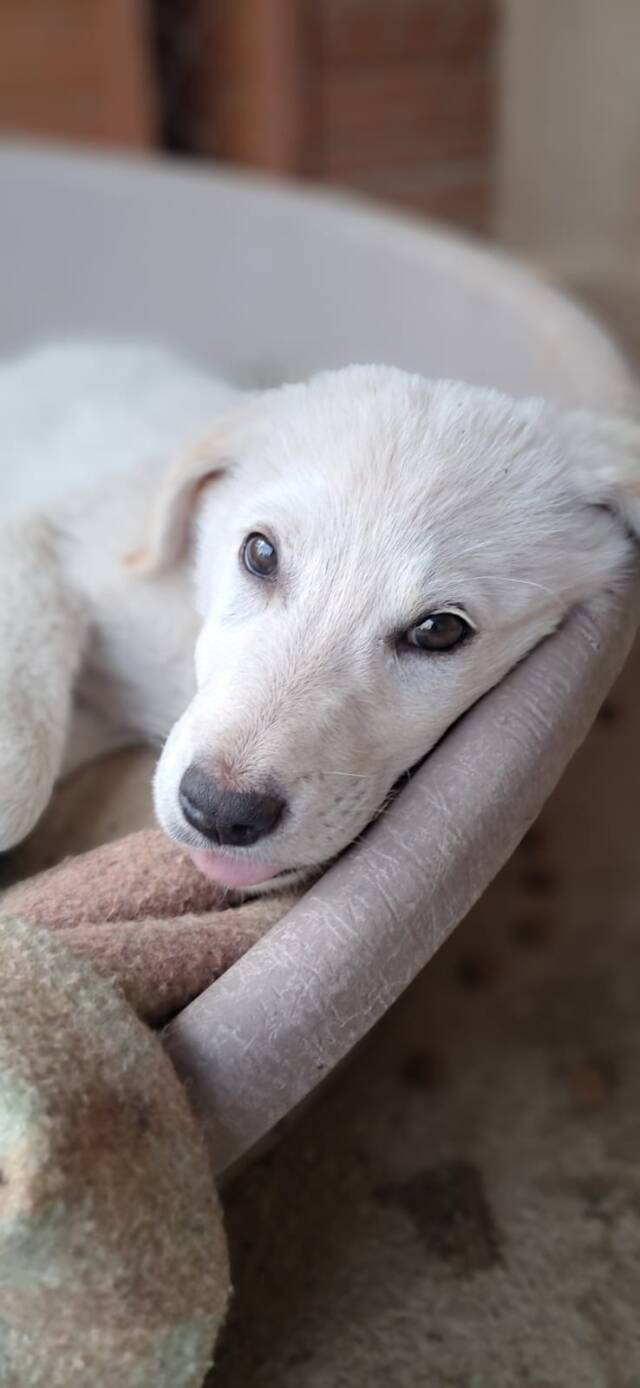 Piuma, das Mädchen mit dem weißen Fell, trägt ihren Namen zu Recht, denn „Piuma“ bedeutet auf Italienisch „Feder, Daune“ und im übertragenen Sinne „etwas „Weiches, Leichtes, Zartes“. Piuma ist zierlicher als ihr Bruder Lino und auch nicht ganz so forsch wie er. Ihr sind Sicherheit und menschliche Nähe sehr wichtig.