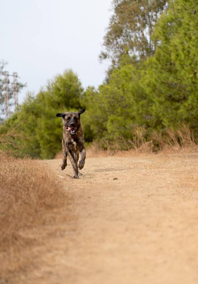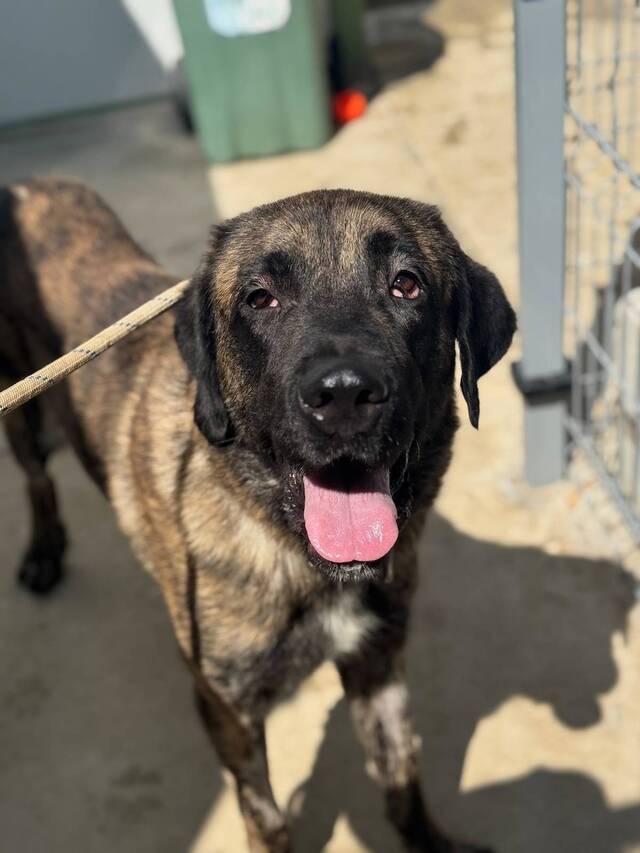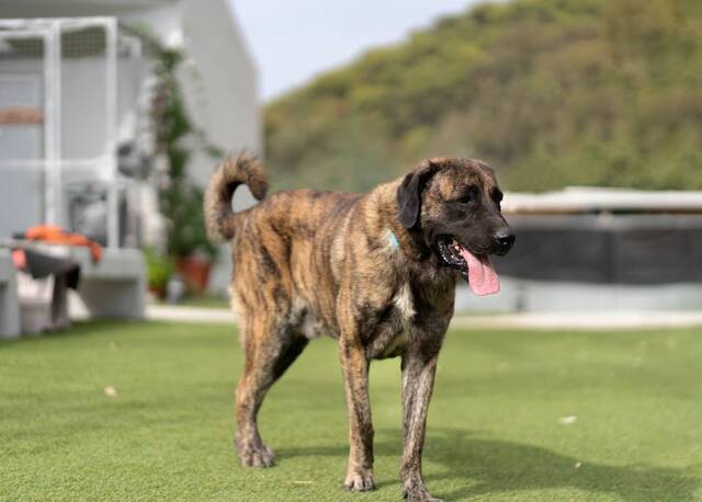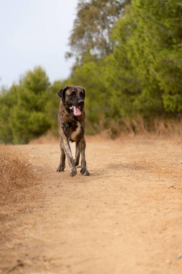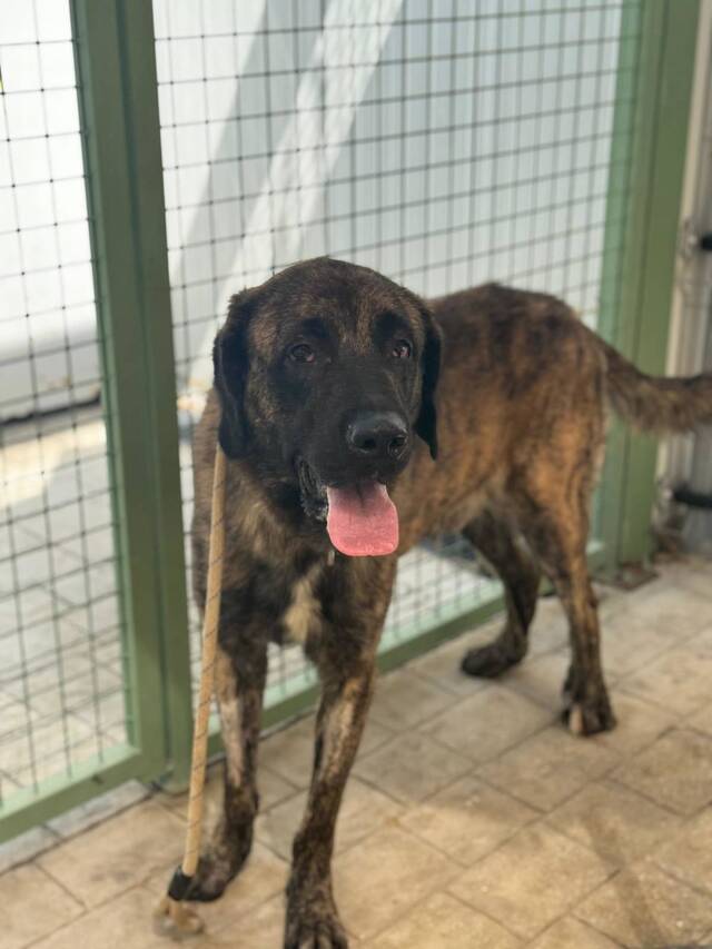 Der große, gestromte Mastín-Mix zeigt sich trotz allem als ruhiger, freundlicher und sozial sehr verträglicher Hund. Im Tierheim lebt er mit zwei älteren Mastín-Hündinnen zusammen und geht bemerkenswert respektvoll mit ihnen um. Auch an der Leine läuft Hermés entspannt und angenehm, gemeinsame Spaziergänge sind ruhig und harmonisch.