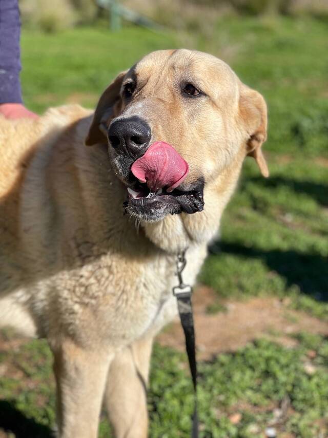 Big Ben ist ein junger, sehr großer Mastín-Typ, der mit seinem goldenen Fell fast wie ein riesiger Labrador wirkt. Mit stolzen 84 cm Schulterhöhe bringt er ordentlich Größe mit, aber sein Wesen ist durch und durch sanft. Im Tierheim lebt er problemlos mit zwei großen Hündinnen und einem mittelgroßen Rüden zusammen und zeigt sich ausgesprochen sozial und verträglich.