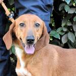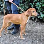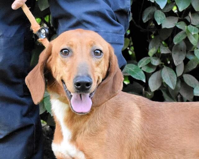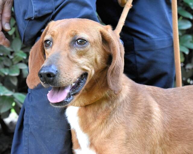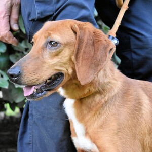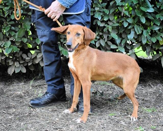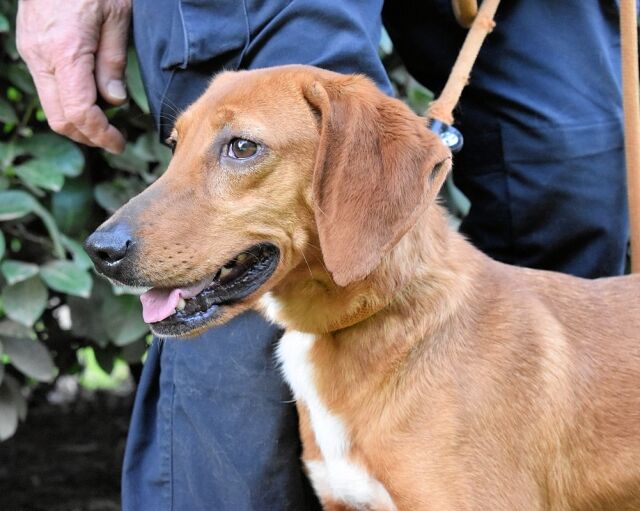 Kurzes, rehbraunes Fell mit weißer Brust und ebensolchen Zehen, Schlappohren bis zum Kinn und ein Blick aus wunderschönen braunen Augen: Clotilda ist nicht nur eine kleine Schönheit, sie hat mit Sicherheit auch ein paar Jagdhundgene im System. Und mit ebensolcher Sicherheit ist sie da, wo sie sich aktuell befindet (hinter Gittern), am komplett falschen Ort.