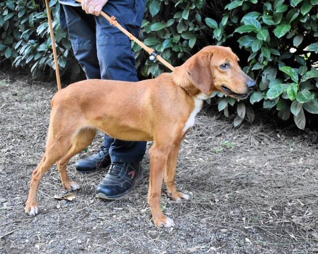 Dank unserer Zusammenarbeit mit italienischen Tierschützern ist es uns aber möglich, einigen der weggesperrten Hunde auf unserer Homepage ein Gesicht zu geben. Und zu diesen Glücklichen gehört auch Clotilda. Im April 2025 durften die Tierschützer Clotilda ein erstes Mal besuchen und fanden eine liebe, neugierige Hündin vor. Sie habe keine Scheu gezeigt und aktiv den Kontakt zu den Zweibeinern gesucht. Sogar ein kurzer Fototermin auf der angrenzenden Wiese sei möglich gewesen, und auch da habe sich Clotilda von ihrer besten Seite gezeigt. Von ihrer besten Jagdhundseite, müsste man anfügen: Nase auf den Boden, und los gehts. Das schon fast vergessene Gras unter den Pfoten, aber vor allem die diversen Gerüche müssen für Clotilda nach den langen Monaten der Gefangenschaft überwältigend gewesen sein. Vermutlich aus diesem Grund hatte sie an jenem Tag ordentlich Zug an der Leine.