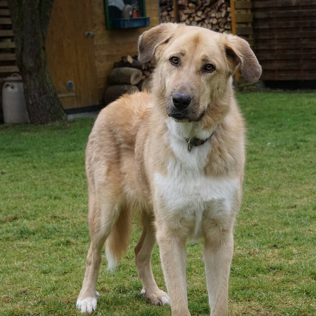 Beschreibung: Update 02.2026 Die Pflegefamilie schreibt: Maximo, der von uns in „Monty“ genannt wird, ist jetzt seit vier Monaten bei uns. In der Zeit hat er sich gut entwickelt, ist zutraulicher geworden und macht unseren Alltag selbstverständlich mit. Im Januar war er mit uns und unseren Hunden gemeinsam im Urlaub und das hat ihm richtig Spaß gemacht! Toben im Schnee und lange Winterspaziergänge waren genau sein Ding. Monty ist sehr gut mit anderen Hunden sozialisiert und liebt es zu spielen. Er geht sehr behutsam mit seinen Artgenossen um, auch mit kleineren Hunden ist das Spielen kein Problem. Findet er einen, der auf seine Spielaufforderungen eingeht, kommt er richtig in Fahrt und rast durch den Garten. Dabei wird er zu einem richtigen Clown, man sieht ihm die Freude regelrecht an. Obwohl er schon drei Jahre alt ist, wird er dann herrlich albern, so, als ob er die verlorenen Jahre im Tierheim aufholen möchte. Fremden Menschen gegenüber ist er weiterhin vorsichtig, aber für Futter nähert er sich gerne an, auch Begegnungen während der Spaziergänge, sei es Jogger, Radfahrer oder Fußgänger, sind zwar noch etwas „komisch“ für ihn, doch er schreckt nur noch selten ängstlich zurück. Das ist ein riesiger Fortschritt! Zurzeit üben wir das Laufen an der Schleppleine und sein erstes Kommando „Sitz“ beherrscht er bereits gut. Autofahren ist überhaupt kein Problem, freiwillig hüpft er zusammen mit unseren eigenen Hunden in den Kofferraum. Im Haus ist Monty ruhig und entspannt, bleibt auch eine längere Zeit mit unseren allein und verhält sich dabei völlig unauffällig. Auch beim Besuch unserer eigenen Kinder – inklusive der beiden kleinen Enkel (2 und 3 Jahre) – hat Monty sich bewährt. Anfangs etwas zurückhaltend, hat seine Neugier schnell gesiegt. Obwohl die Kleinen schon ziemlich laut und beweglich sind, legt er sich ganz entspannt in unmittelbarer Nähe hin. Grundsätzlich sucht er die Nähe von vertrauten Personen und liegt gelöst unter dem Schreibtisch, wenn wir im Homeoffice arbeiten oder vor der Couch, wenn wir Fernsehen schauen. Monty hat wirklich gute Fortschritte gemacht und ist bereit für den Weg in ein neues Zuhause, in dem er Liebe, Verständnis sowie genügend Zeit bekommt, sich weiter zu entwickeln.