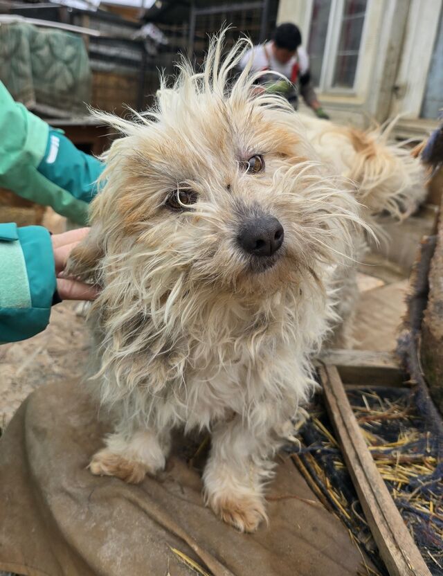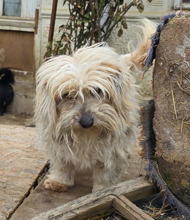 Fred, Mischlingsjunge (Bichon Frisé/Malteser Mix?), geboren am 17.10.2024, hat eine Schulterhöhe von ca. 30 cm und wiegt ca. 8 kg.
