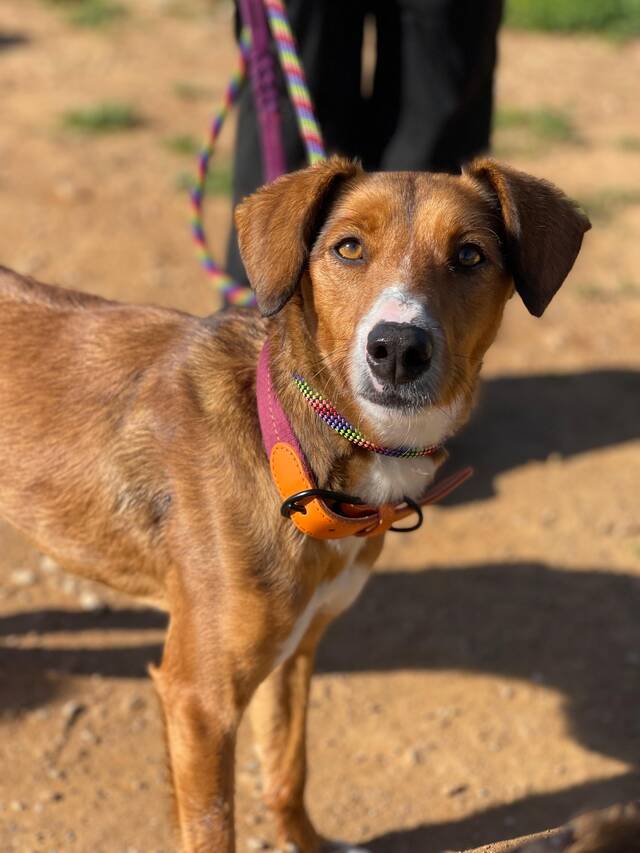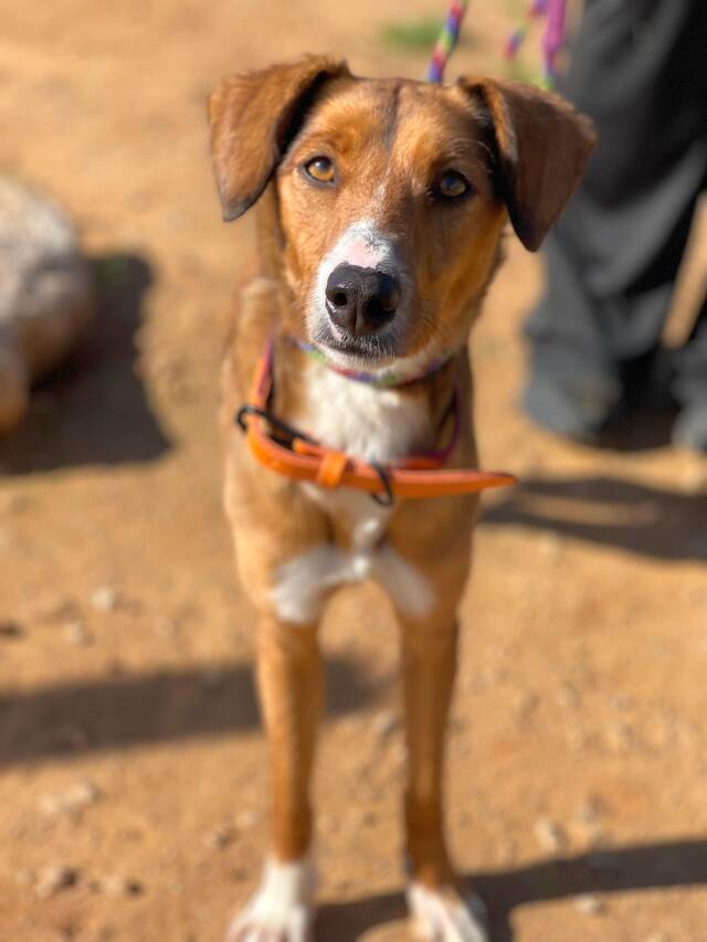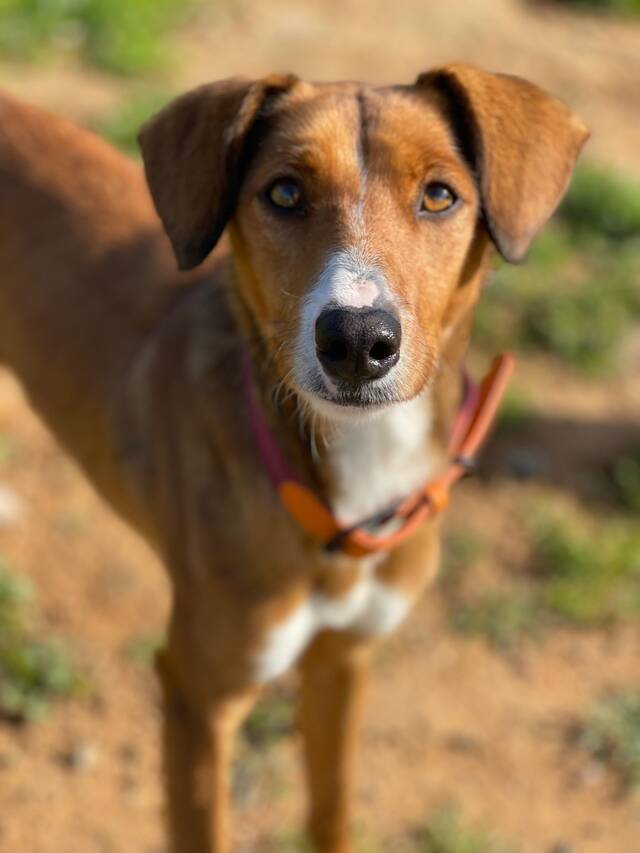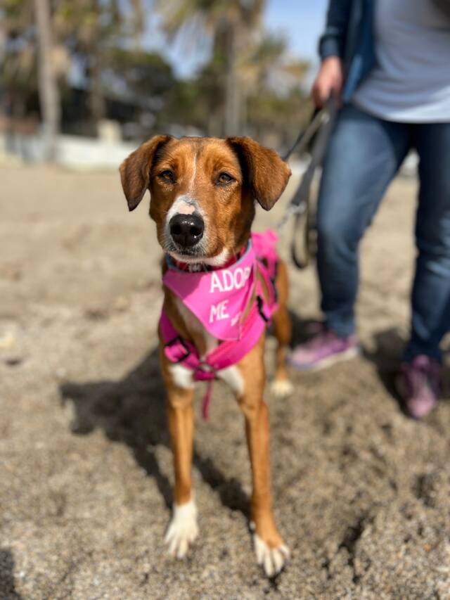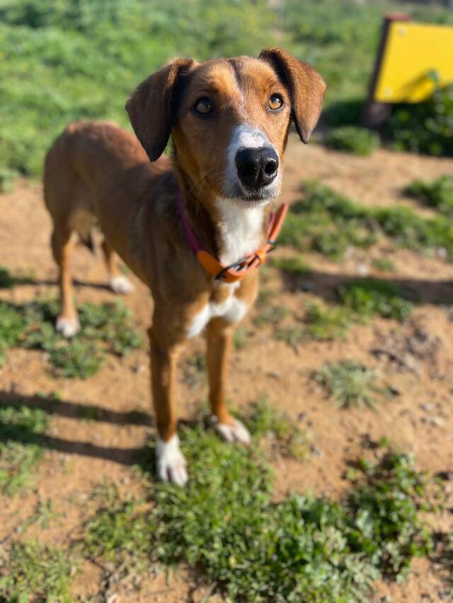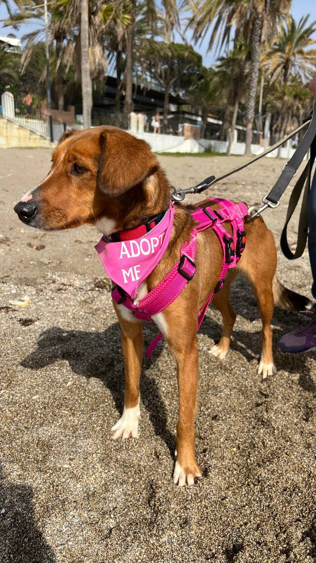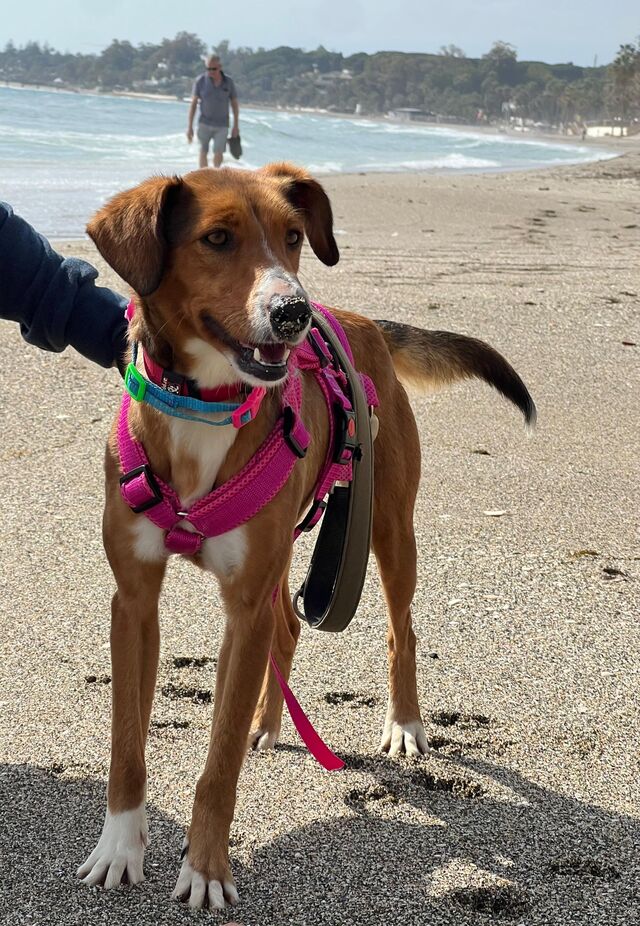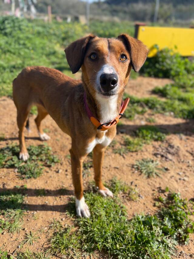 Beschreibung: Elektra (*ca. 10/2023, ca. 48 cm) ist eine wunderschöne Mischlingshündin, die nur wenige Tage nach einem anderen Hund namens Egon allein und ohne Mikrochip auf der Straße gefunden wurde. Da die beiden sich sehr ähnlich sehen und im selben Gebiet gefunden wurden, gehen wir davon aus, dass sie Geschwister sind. Im Tierheim TripleA in Marbella lebt Elektra seit ihrer Ankunft Mitte Februar 2026 in einer Gruppe mit anderen Hunden zusammen und sie zeigt sich sehr sozial allen gegenüber. Die zauberhafte Hündin hat auch schon an einem „dog of he day“ teilgenommen, bei dem ein Tagesausflug außerhalb des Tierheims mit den Hunden gemacht wird, den sie ganz hervorragend gemeistert hat! Alles war zwar neu für sie, und sie erkundete neugierig ihre Umgebung, aber sie zeigte sich überhaupt nicht scheu und sehr brav. Fremde Leute, entgegenkommende Fahrräder, Kinderwagen oder Roller stellten kein Problem für sie dar. Auch das Laufen am Strand machte ihr großen Spaß und Wellen und Wasser schreckten sie nicht ab!