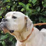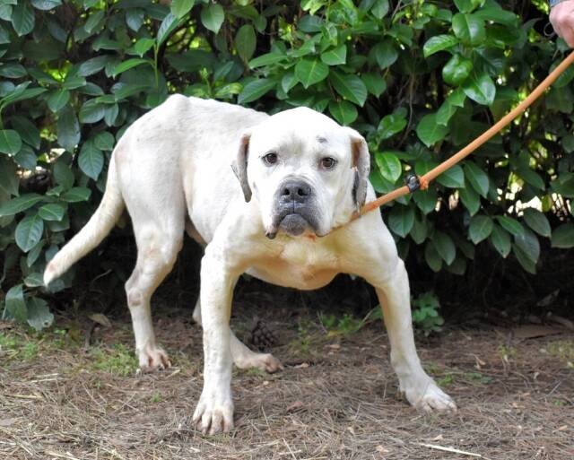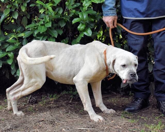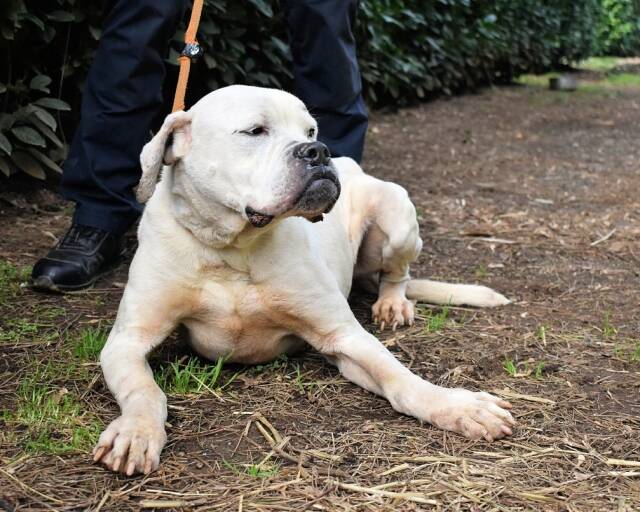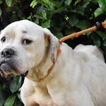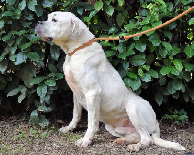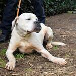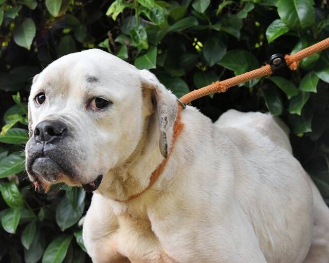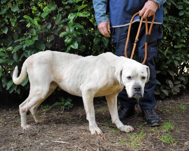 Unser fast ganz schneeweißes Riesenbaby Dollaro sucht noch immer ganz dringend eine Familie. SEINE Familie. Dollaro ist etwas älter als vier Jahre (Stand Mai 2023) und lebt hinter Gittern seit er ein Welpe war. Bis vor kurzem zusammen mit seinem Bruder Dimitri. Letzterer ist nicht minder hübsch als Dollaro, aber weiß mit gestromten Flecken sowie gepunkteten Öhrchen. Die beiden Kraftpakete verstanden sich immer sehr gut, sind aber in ihren viel zu kleinen Betonboxen am komplett falschen Ort. Die beiden müssten sich auspowern können, sie wollen über Wiesen flitzen, im Garten toben, abends rumalbern und vor Glück und Sorglosigkeit tief seufzen, wenn ihr Lieblingsmensch sie krault und liebkost, bis sie eingeschlafen sind. Ja, so sehen Hundeträume aus. Und genau so soll es werden für Dollaro und Dimitri, und zwar presto.