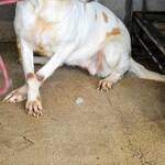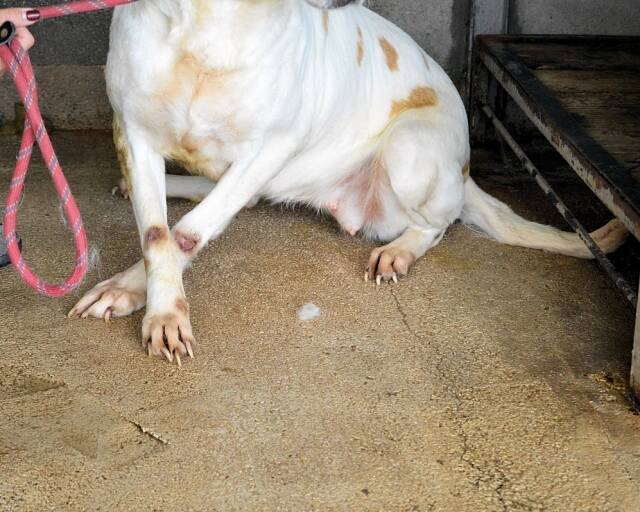 Was auffällt: Ihre Vorderbeine sind wund geleckt, als müsste sie sich irgendwo abreagieren um ihren Stress loswerden. Auch die unteren beiden Zitzen wirken geschwollen – vielleicht eine Folge ihres schwierigen Vorlebens, vielleicht ein Hinweis auf alte Trächtigkeiten oder Milchleiste.